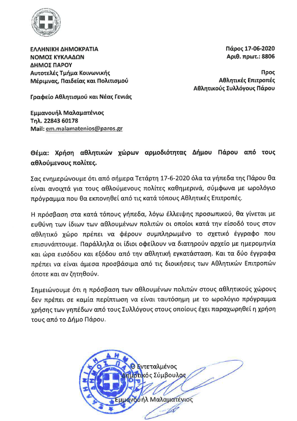 Ανακοίνωση για τη χρήση αθλητικών χώρων αρμοδιότητας Δήμου Πάρου